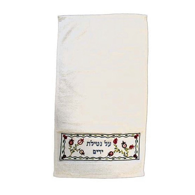 Serviette raffinée Netilat Yadayim, modèle « Grenades », réalisée par l'artiste israélien Yaïr Emanuel.